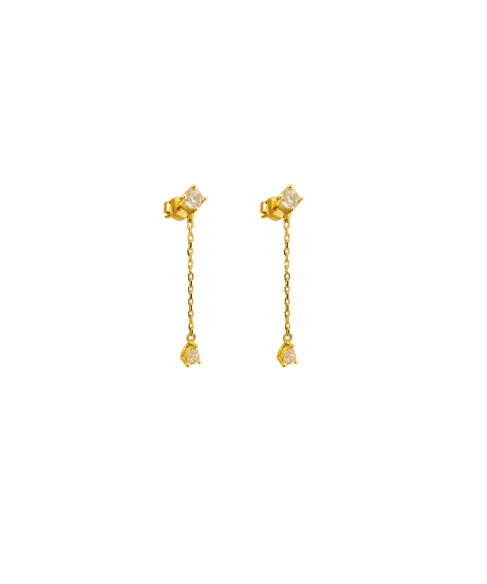 Προσθέστε στη συλλογή σας αυτά τα κρεμαστά σκουλαρίκια που συνδυάζουν τη διακριτική πολυτέλεια με τη μοντέρνα αισθητική. Είναι κατασκευασμένα από ασήμι 925, επιχρυσωμένα και διαθέτουν μία λεπτή αλυσίδα που συνδέει δύο λευκά ζιργκόν. Είναι το τέλειο κόσμημα για να προσθέσετε κίνηση και μια πινελιά λάμψης στην καθημερινή ή βραδινή σας εμφάνιση.