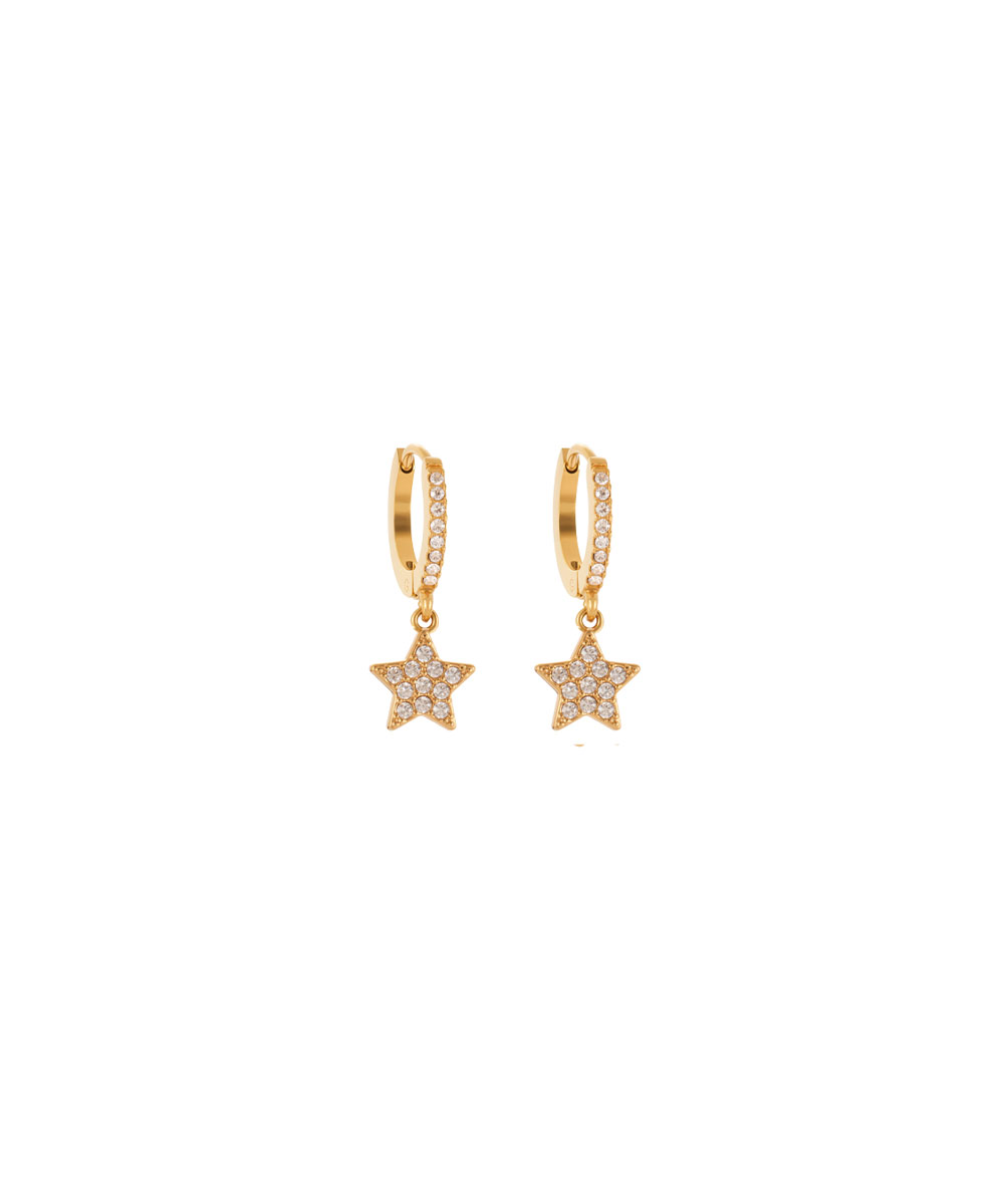 Αυτοί οι χρυσοί κρίκοι προσθέτουν μια νότα λάμψης σε κάθε εμφάνιση. Το κόσμημα είναι κατασκευασμένο από υψηλής ποιότητας ανοξείδωτο ατσάλι, υποαλλεργικό, ανθεκτικό και αδιάβροχο. Το σχέδιο αποτελείται από έναν μικρό κρίκο που είναι διακοσμημένος με αστραφτερά λευκά ζιργκόν, απο τον οποίο κρέμεται ένα αστέρι, επίσης καλυμμένο με ζιργκόν, δημιουργώντας ένα εκθαμβωτικό αποτέλεσμα. Τα σκουλαρίκια με συνολικό ύψος 2,5 εκατοστά και πλάτος σχεδίου 1 εκατοστό είναι κατάλληλα για να φορεθούν μόνα τους ή σε συνδυασμό με άλλα αξεσουάρ.