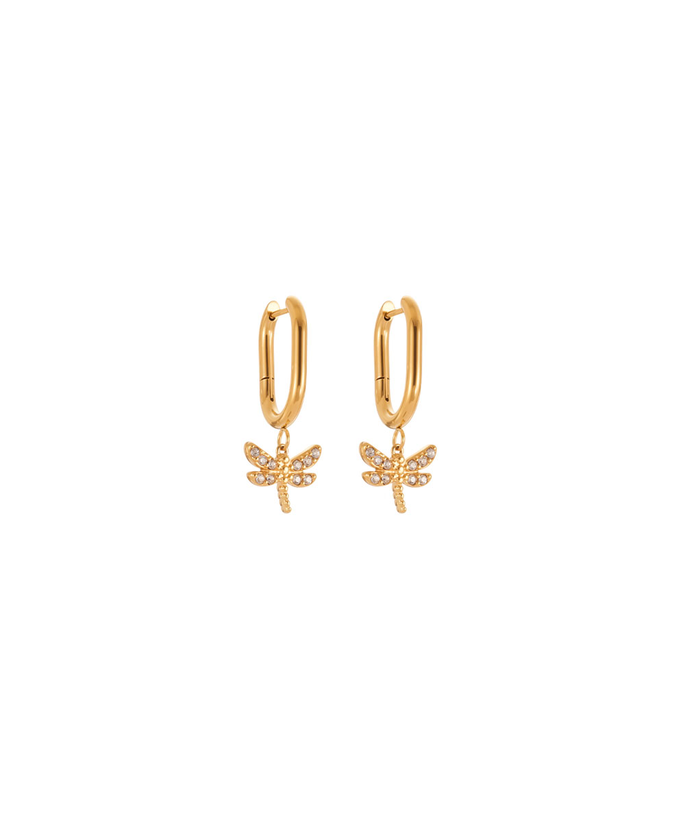 Κρίκοι σκουλαρίκια με λιβελούλα και λευκά ζιργκόν από ανοξείδωτο ατσάλι σε χρυσή απόχρωση