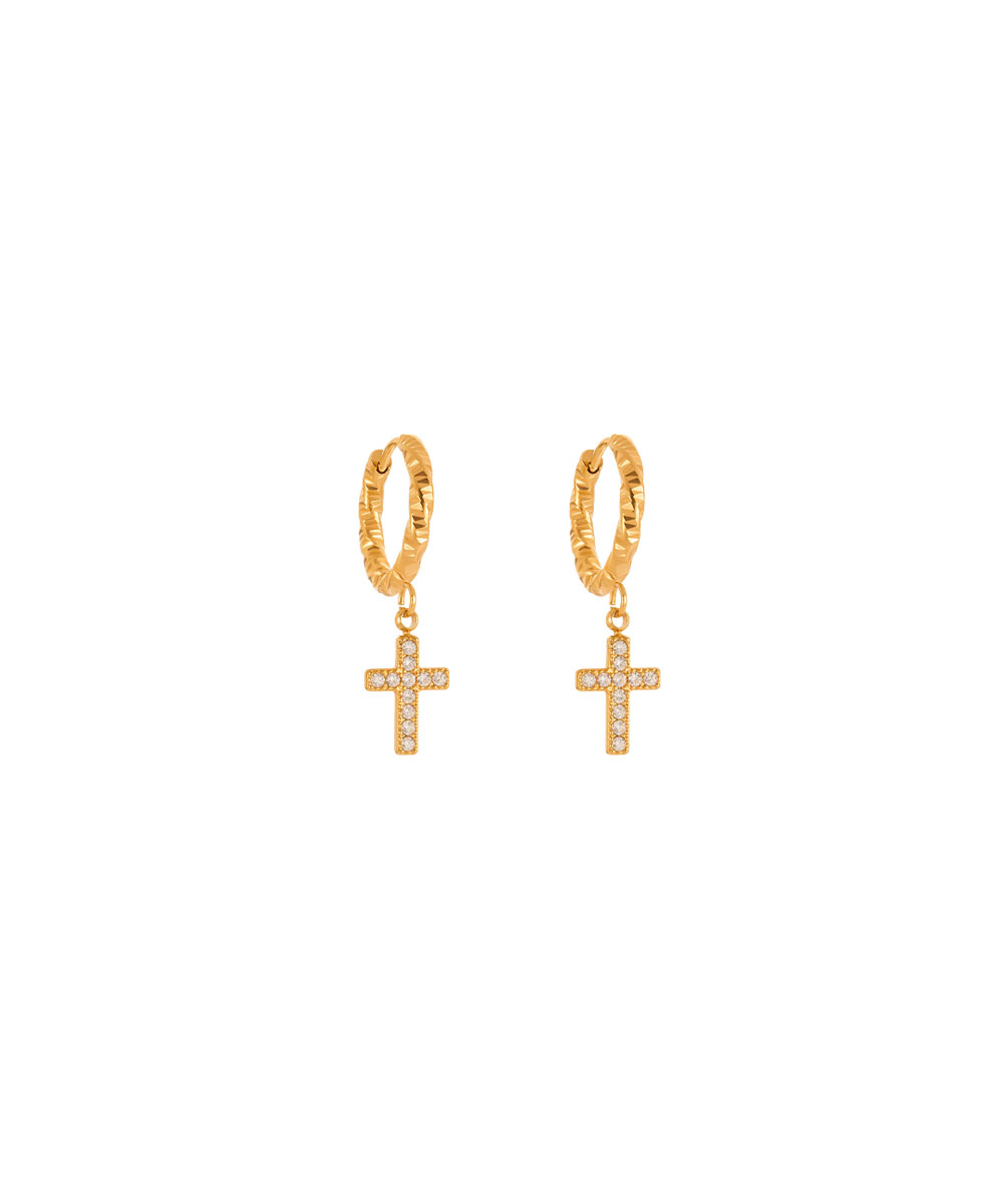 Κρίκοι σκουλαρίκια με σταυρό και λευκά ζιργκόν από ανοξείδωτο ατσάλι σε χρυσή απόχρωση