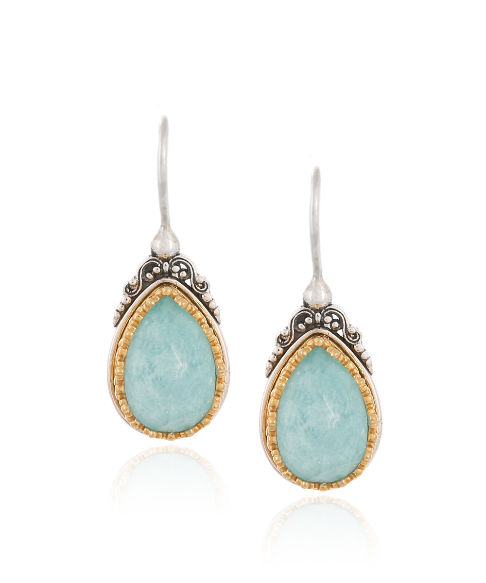 Ασημένια κρεμαστά χειροποίητα βυζαντινά σκουλαρίκια GEROCHRISTO με αμαζονίτη σε σχήμα δάκρυ και επιχρυσωμένο δέσιμο