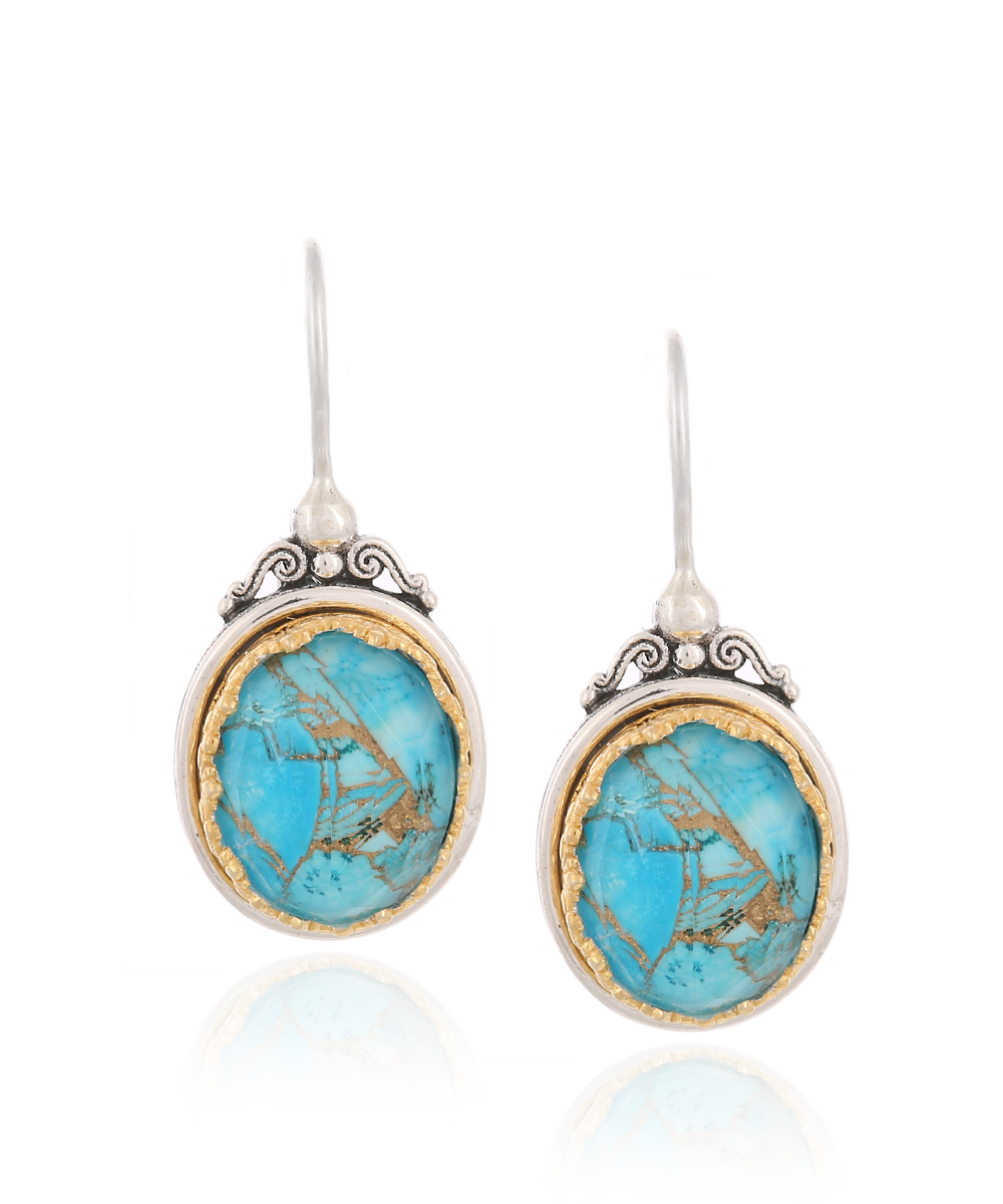 Ασημένια κρεμαστά χειροποίητα βυζαντινά σκουλαρίκια GEROCHRISTO με τυρκουάζ copper σε οβάλ σχήμα και επιχρυσωμένο δέσιμο