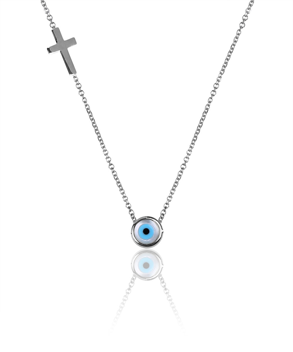 Λευκό χρυσό 9Κ κολιέ με ματάκι και σταυρουδάκι