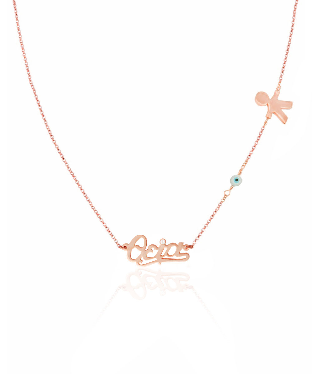 Ασημένιο κολιέ θεία με ματάκι και ένα αγοράκι ή κοριτσάκι επιχρυσωμένο με ροζ χρυσό