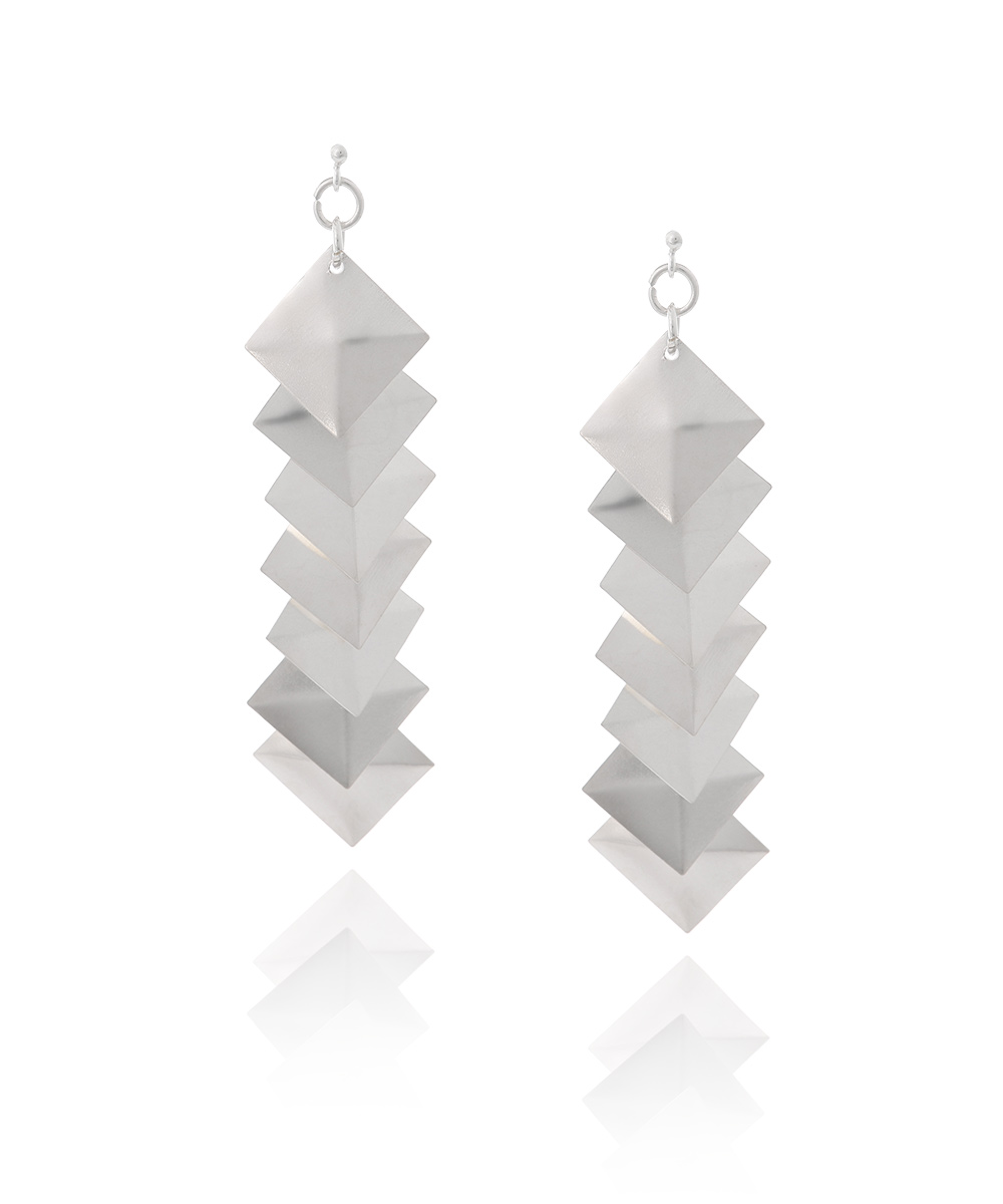 Ασημένια Καρφωτά Χειροποίητα Σκουλαρίκια σε εντυπωσιακό Σχέδιο με Κρεμάμενα Γεωμετρικά Σχέδια Πυραμίδες και διακριτική Μπίλια στην κορυφή