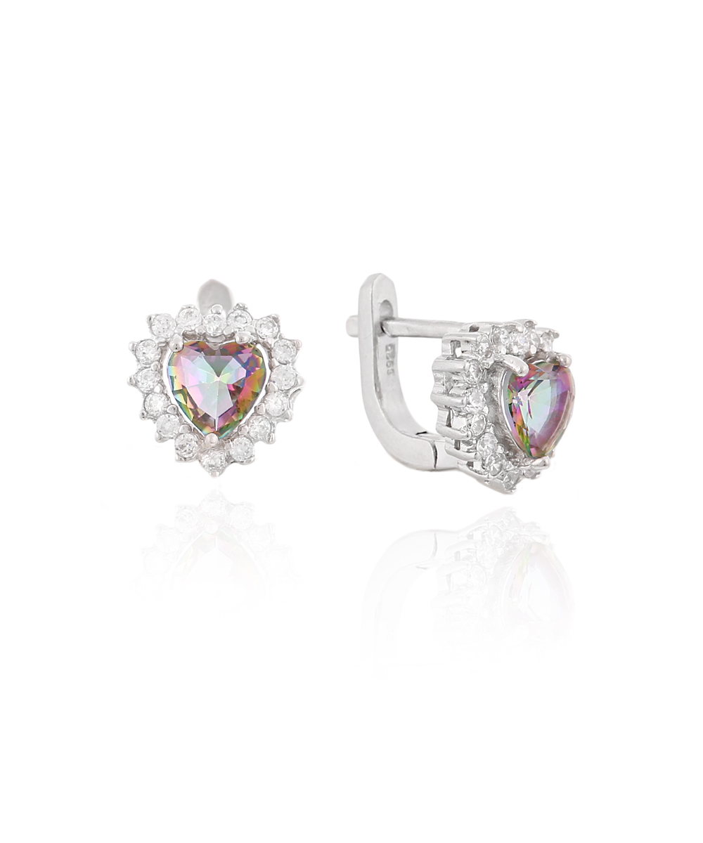 Ασημένια Σκουλαρίκι Μονόπετρα με French Clip σε σχήμα Καρδιάς με λευκά Ζιργκόν και μυστικιστικό τοπάζι