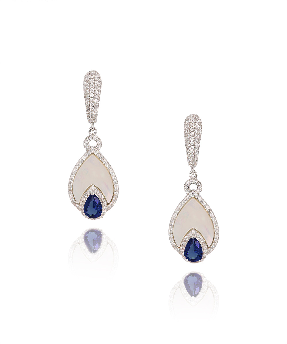 Ασημένια Σκουλαρίκια με French Clip σε σχήμα σταγόνας με Φίλντισι, λευκά Ζιργκόν και μπλε πέτρα