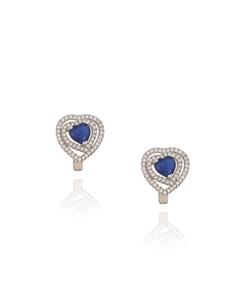 Ασημένια Σκουλαρίκια με French Clip σε σχήμα Καρδιάς με λευκά Ζιργκόν και μπλε Πέτρα