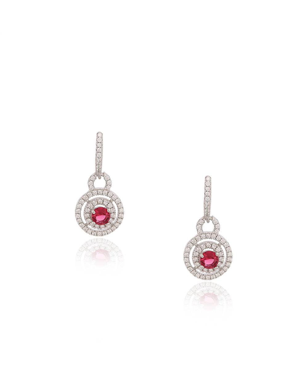Ασημένια Μονόπετρα Κρεμαστά Σκουλαρίκια-Κρίκοι σε στρογγυλό σχήμα με λευκά Ζιργκόν και ροζ πέτρα
