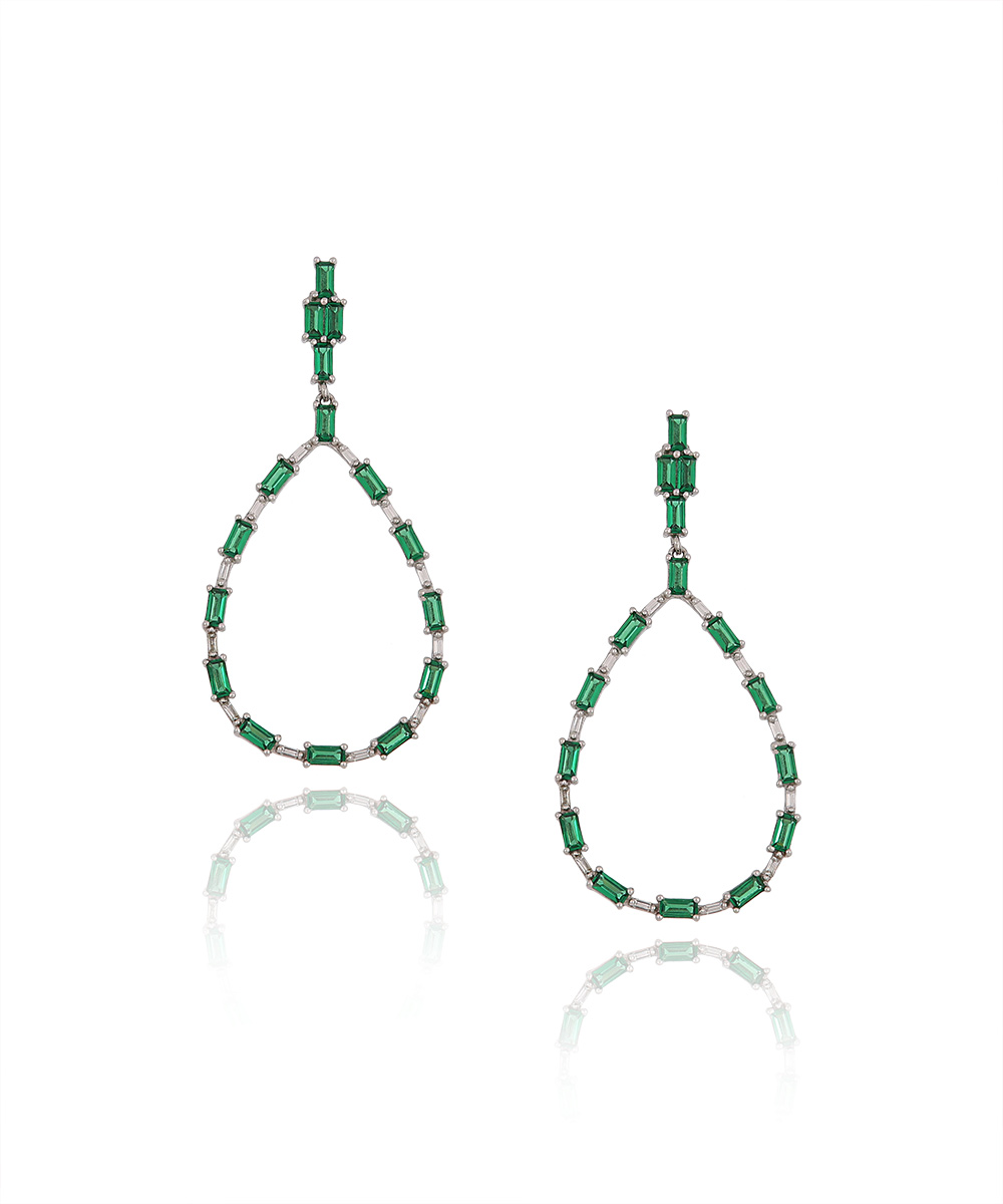 Ασημένια Καρφωτά Σκουλαρίκια Ear Jackets στολισμένα με λευκά Ζιργκόν και Πράσινες Πέτρες σε ιδιαίτερα Γεωμετρικά σχήματα