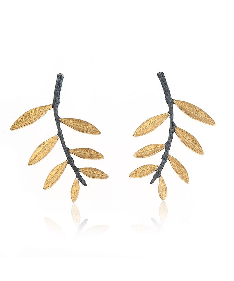 Ασημένια χειροποίητα κρεμαστά σκουλαρίκια σε σχήμα κλαδιού ελιάς επιχρυσωμένα