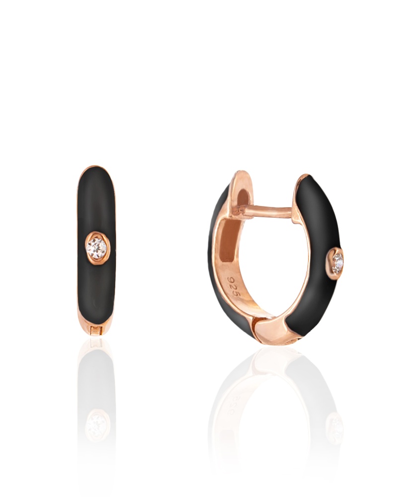 Ασημένια Επιχρυσωμένα με Ροζ Χρυσό Σκουλαρίκια Κρίκοι με μαύρο Σμάλτο και Ζιργκόν