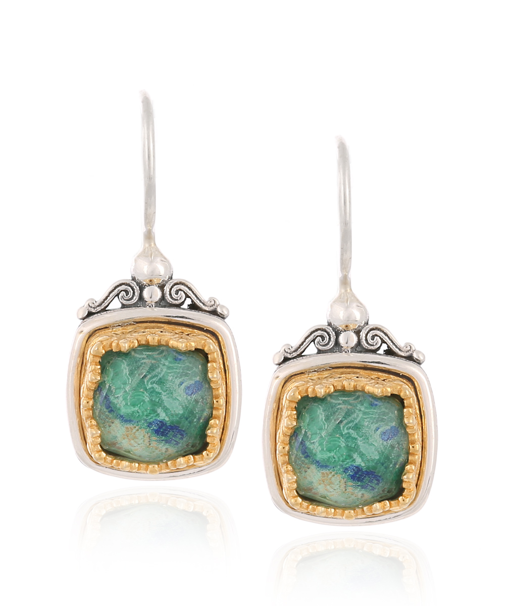 Ασημένια κρεμαστά χειροποίητα βυζαντινά σκουλαρίκια GEROCHRISTO με αζουρίτη σε τετράγωνο σχήμα και επιχρυσωμένο δέσιμο