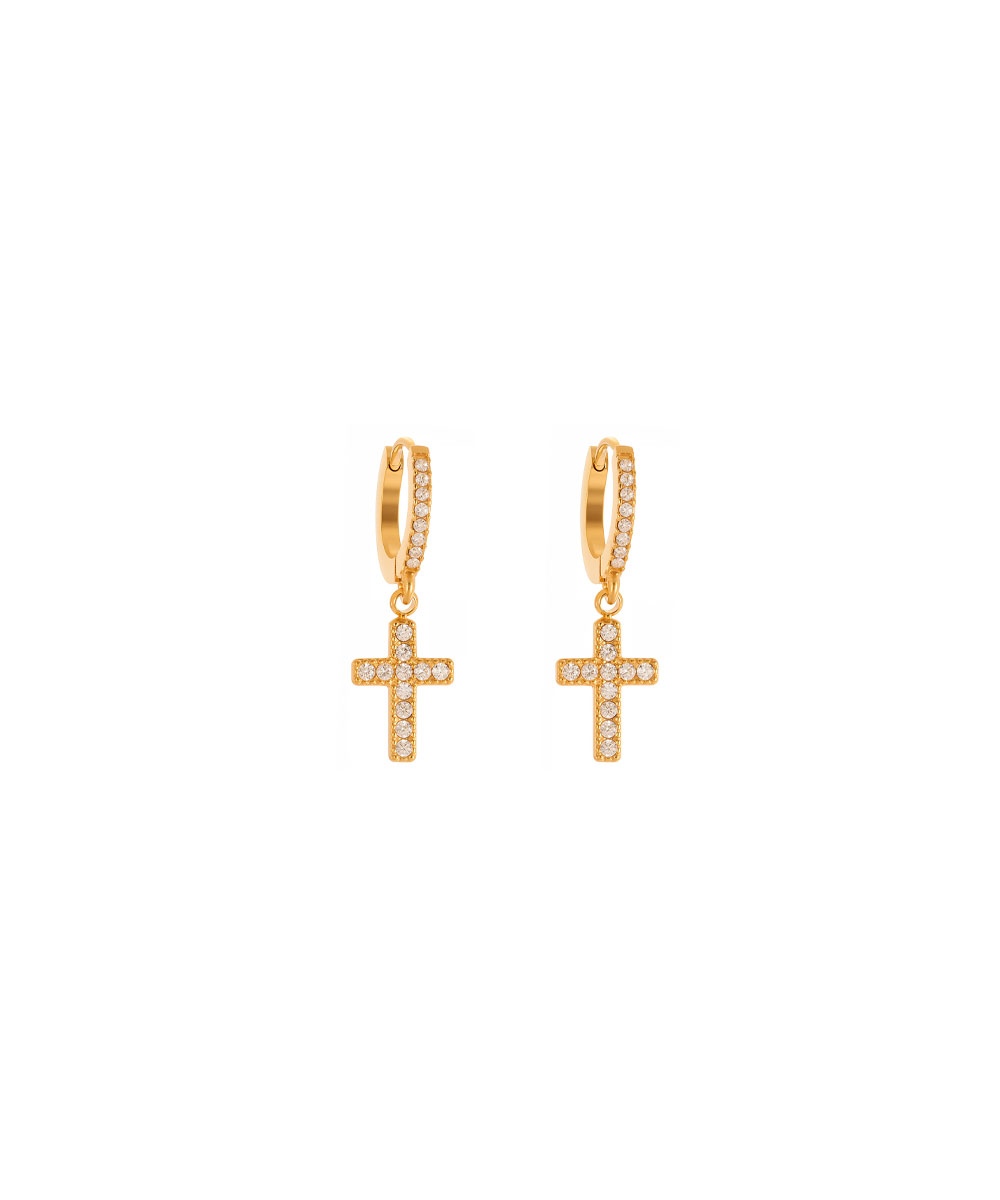 Κρίκοι σκουλαρίκια με σταυρό και λευκά ζιργκόν από ανοξείδωτο ατσάλι σε χρυσή απόχρωση
