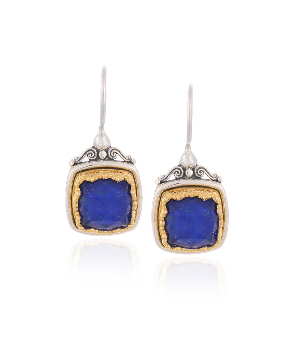 Ασημένια κρεμαστά χειροποίητα βυζαντινά σκουλαρίκια GEROCHRISTO με λάπις λάζουλι σε τετράγωνο σχήμα και επιχρυσωμένο δέσιμο