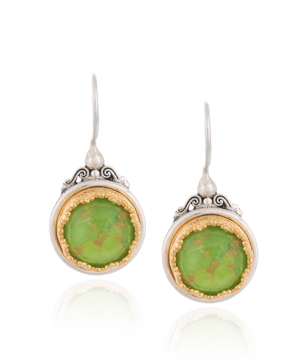 Ασημένια κρεμαστά χειροποίητα βυζαντινά σκουλαρίκια GEROCHRISTO με πράσινο τυρκουάζ copper σε στρογγυλό σχήμα και επιχρυσωμένο δέσιμο