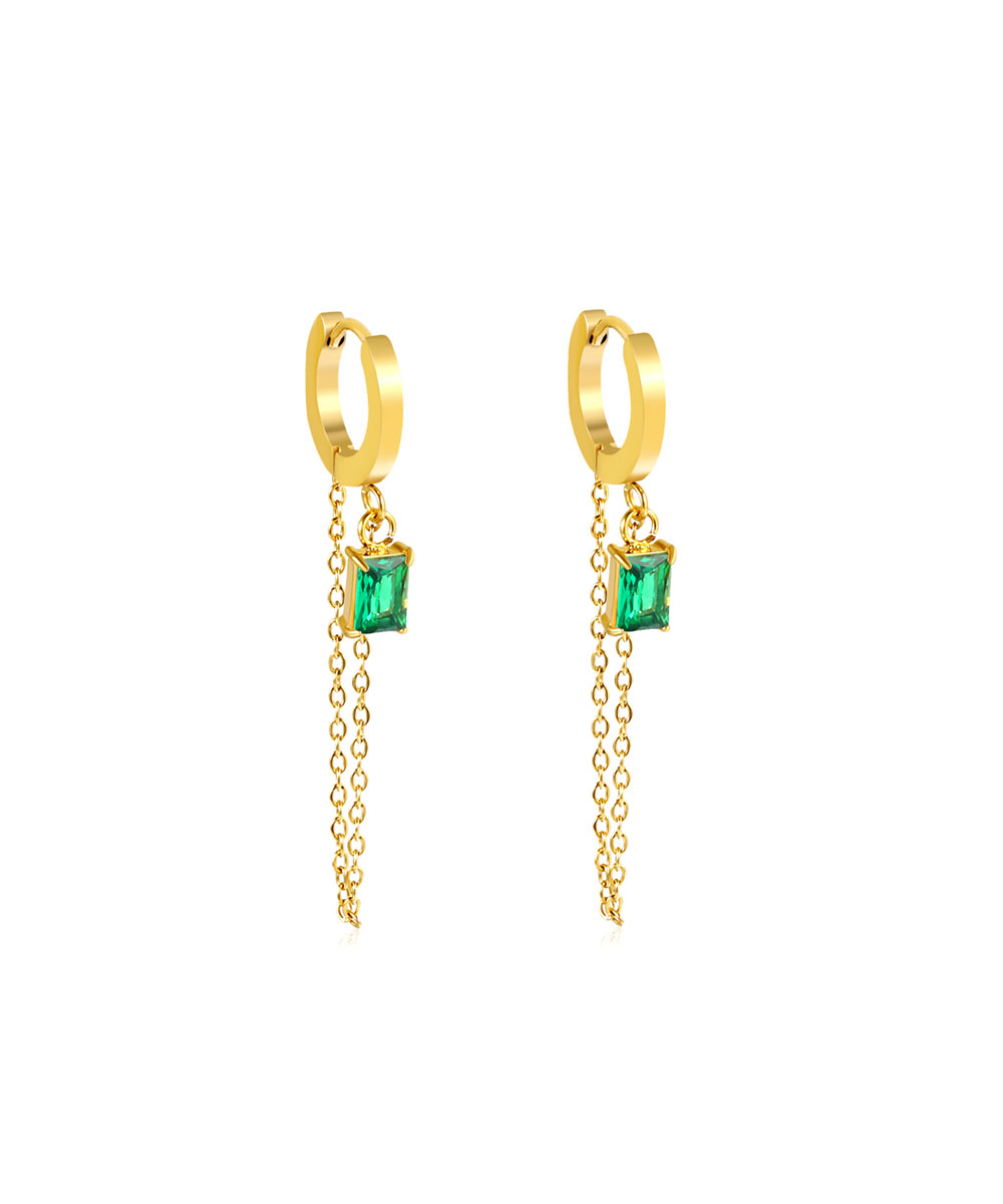 Κρίκοι σκουλαρίκια με πράσινο ζιργκόν και αλυσίδα από ανοξείδωτο ατσάλι σε χρυσή απόχρωση